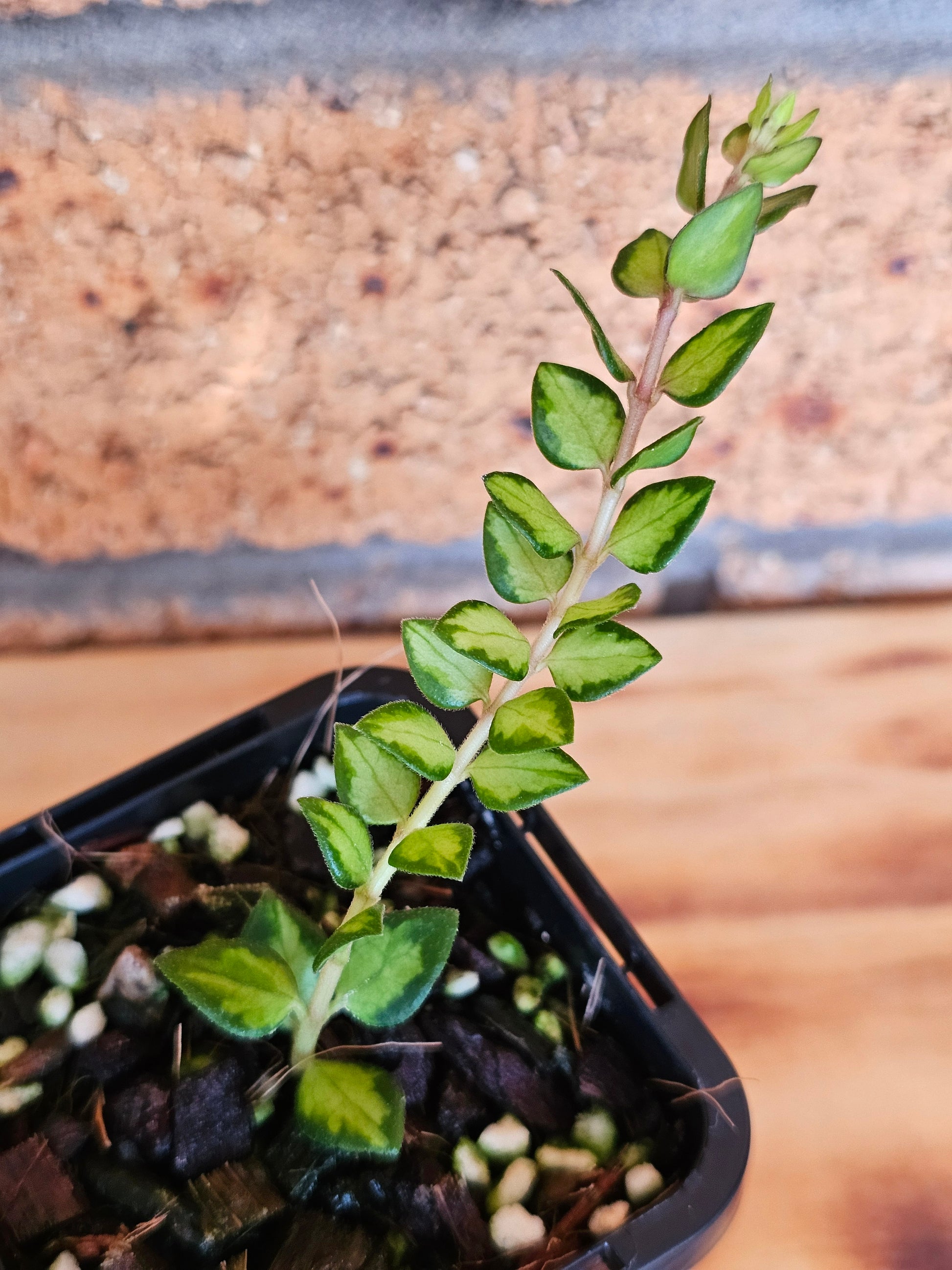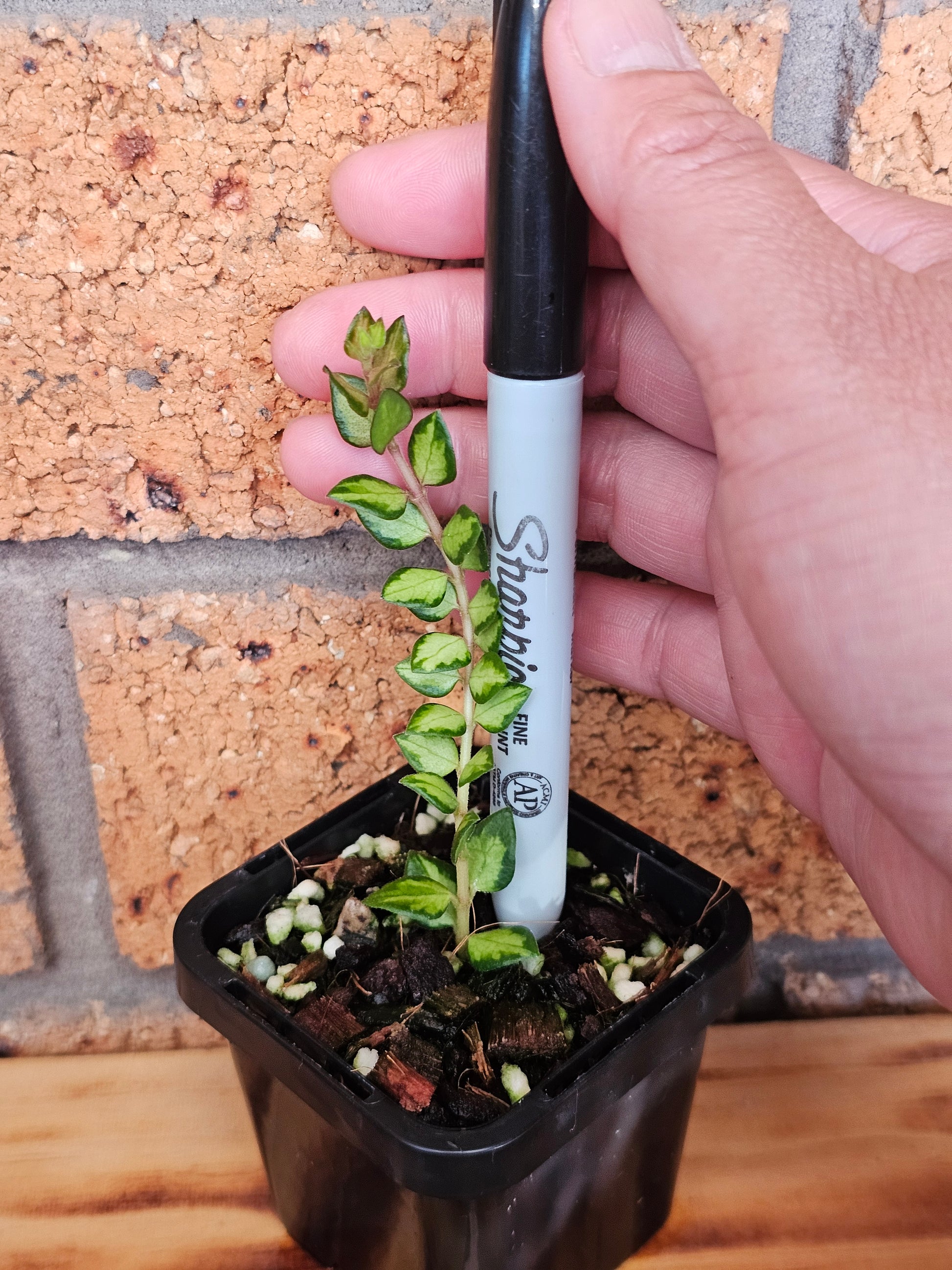 Hoya chinghungaensis variegated, currently growing in 7cm square squat black nursery pot.