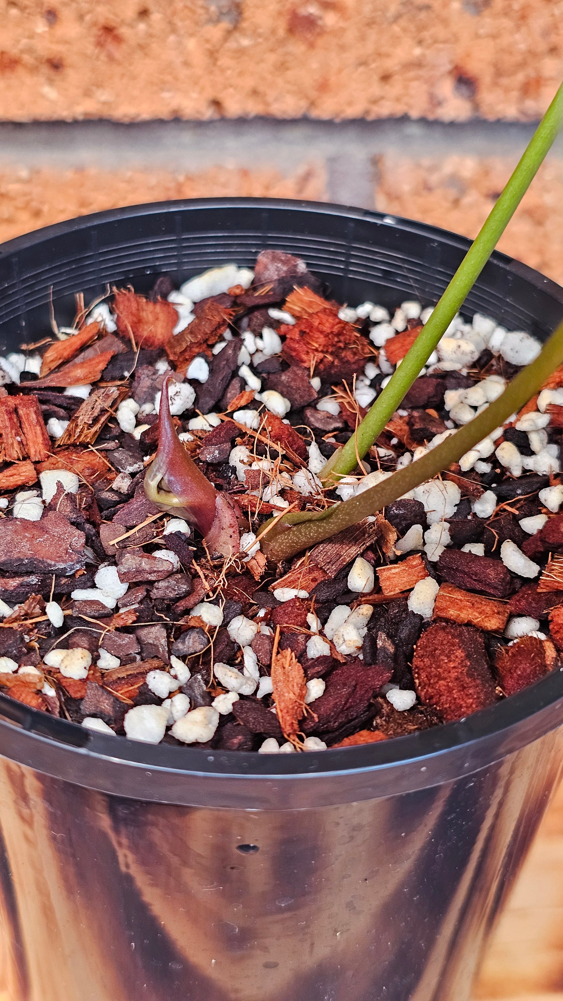 Anthurium Dark Complex, established plant and potted in a special aroid mix with orchiata bark and others growing media, pot size is12cm black nursery pot.