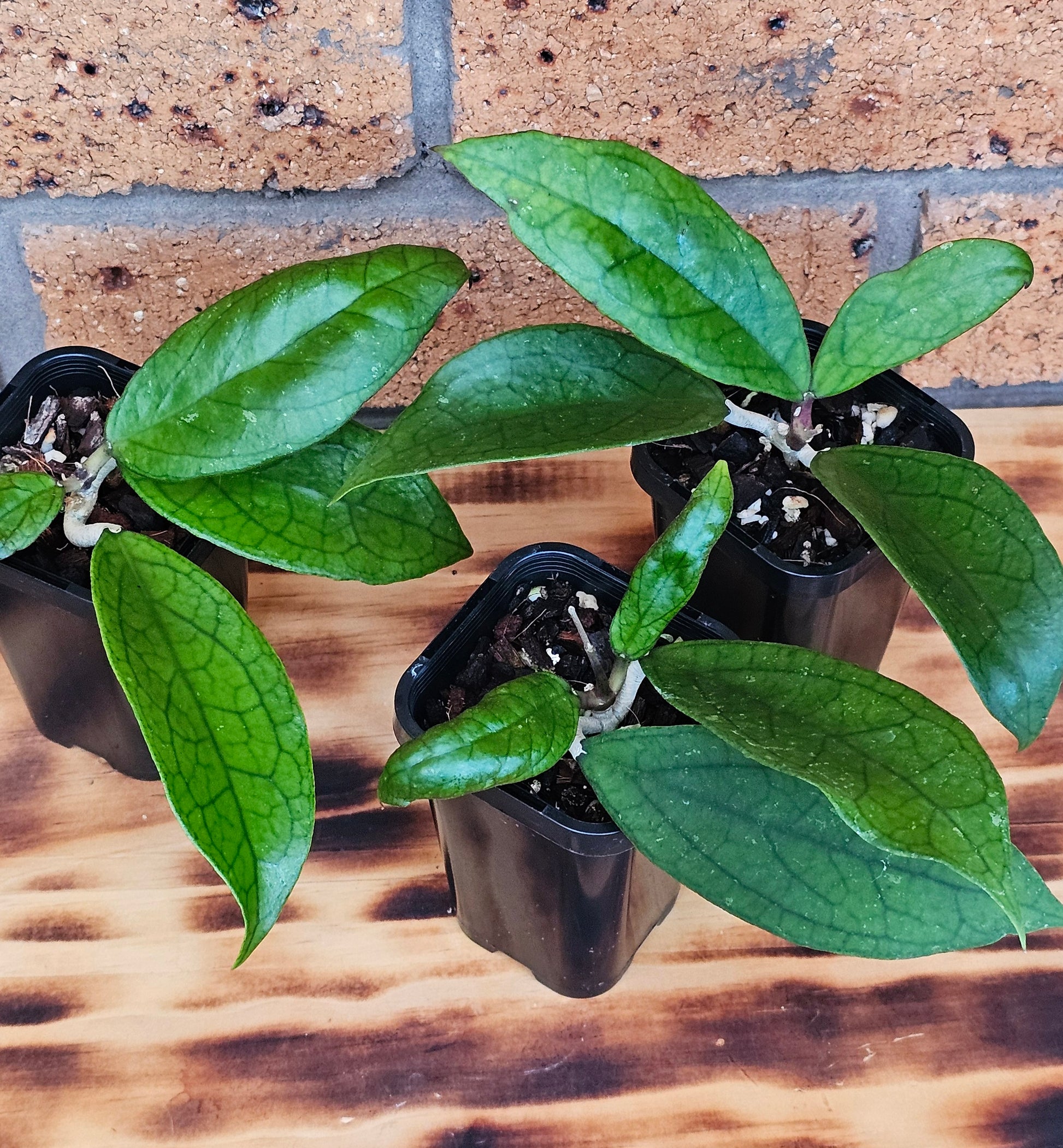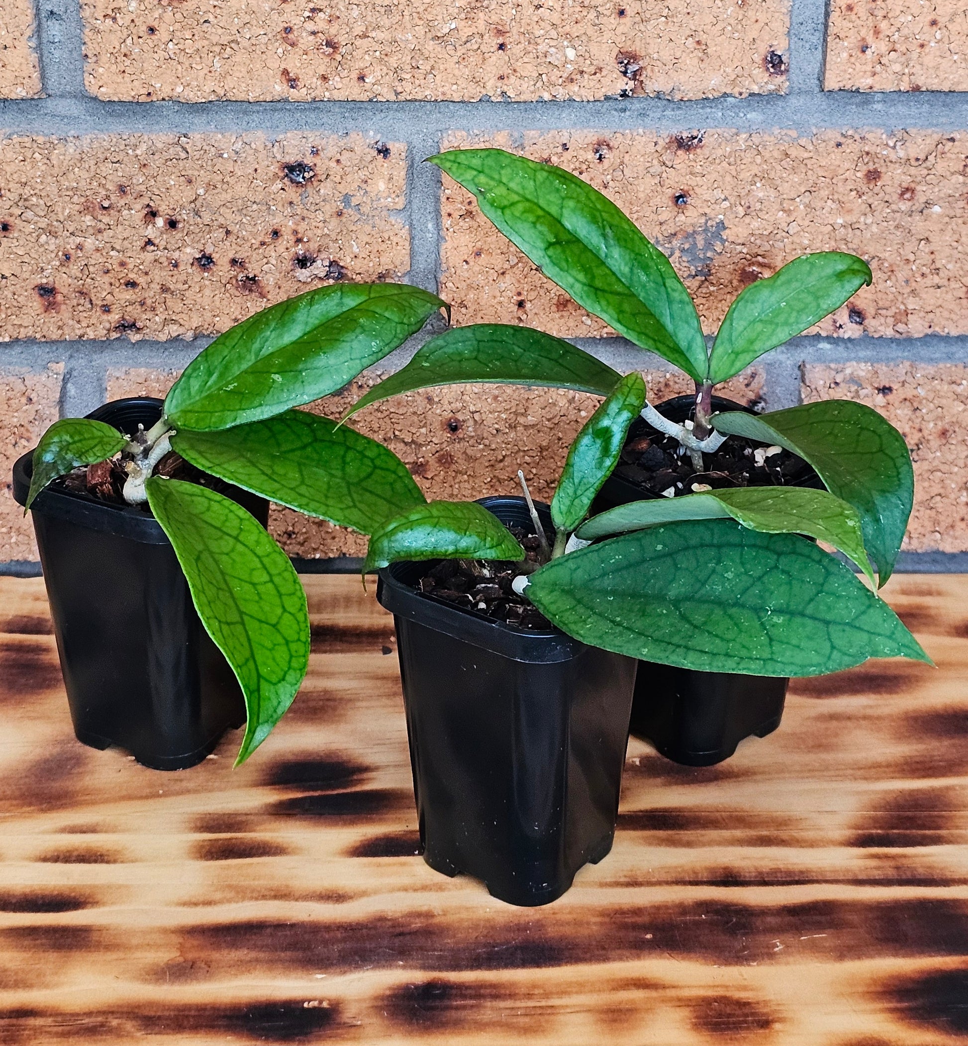 Hoya 'Jennifer' (H. Incrassata X H. Finlaysonii ) currently growing in 7cm square black tube nursery pots.